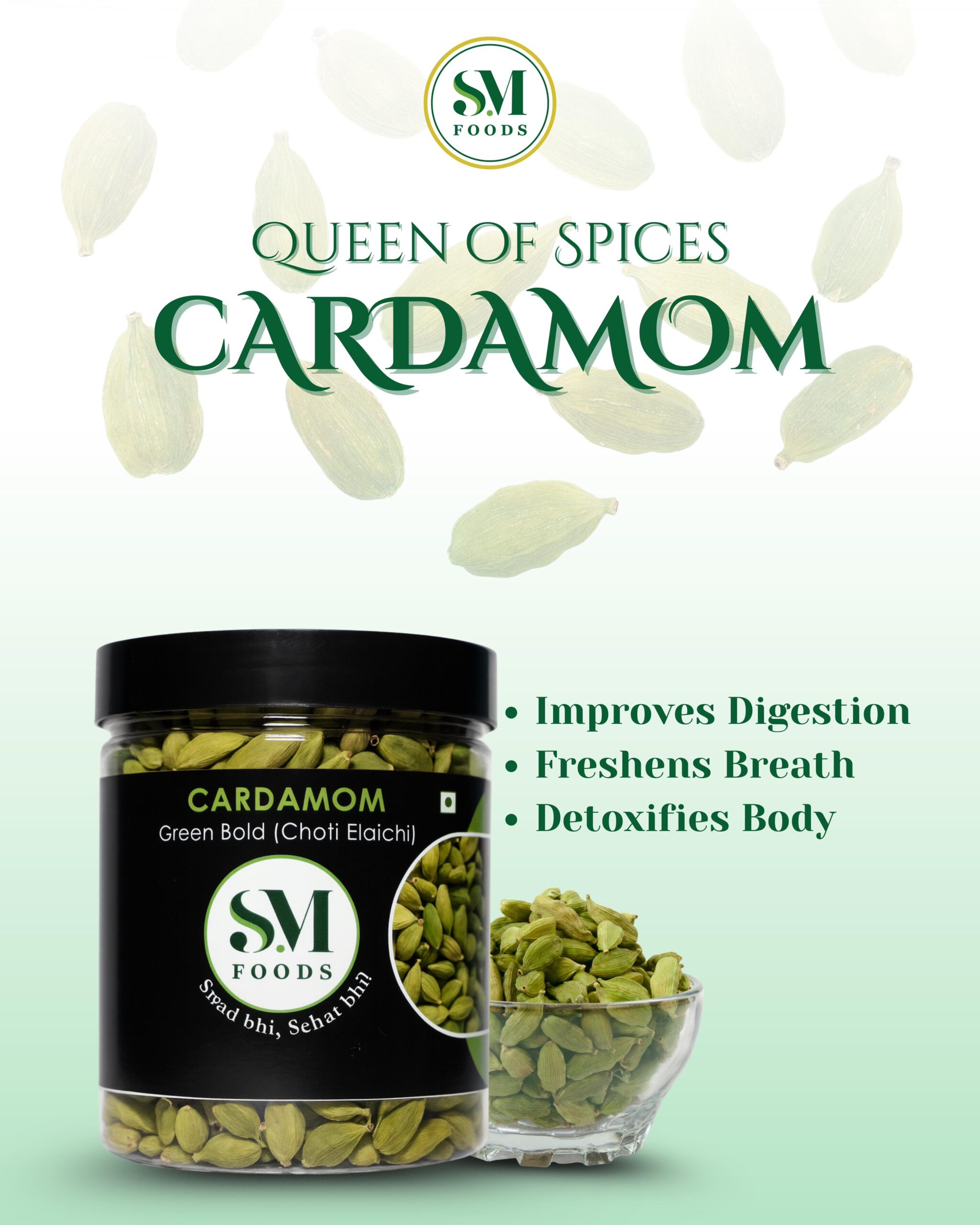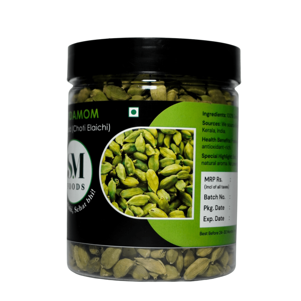 October 15, 2025Whole Green Cardamom (Elaichi) from SM Foods, size 6–7mm. Known as the ‘Queen of Spices’, it adds a rich, aromatic flavor to curries, rice, tea, herbal drinks, and sweets. A key ingredient in garam masala, cardamom enhances both traditional and modern dishes. Handpicked and high-quality, perfect for daily cooking or festive recipes.